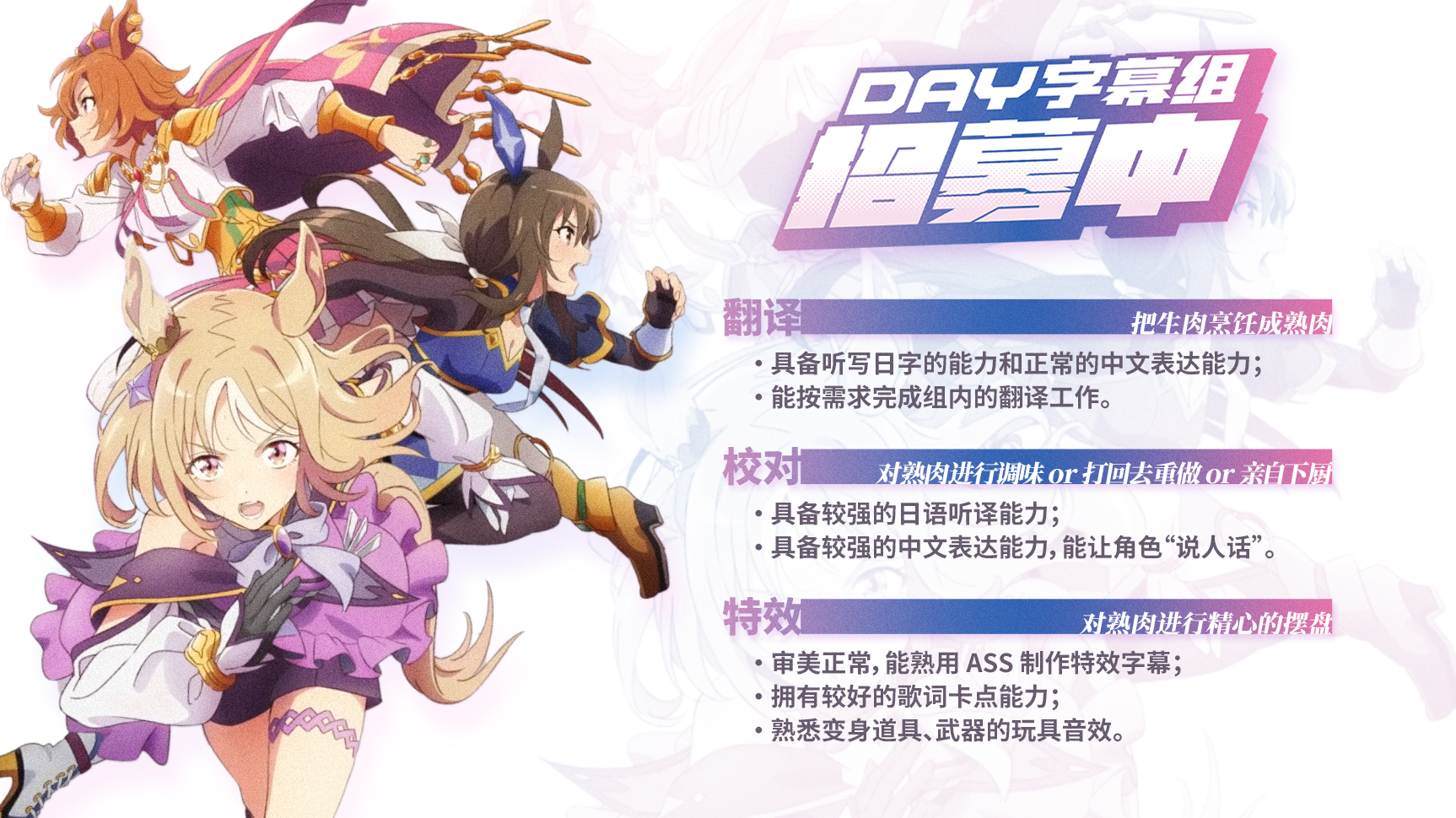 [color=rgba(0, 0, 0, 0.73)][font=RobotoDraft, Roboto, "Helvetica Neue", "Hiragino Sans GB", 冬青黑体, "Microsoft YaHei", 微软雅黑, 文泉驿微米黑, sans-serif]翻译:能一周产出一集(老番不太要求速度),具备听写日字的能力(会有番外的日字听写)和中文表达能力(急招)[/font][/color]